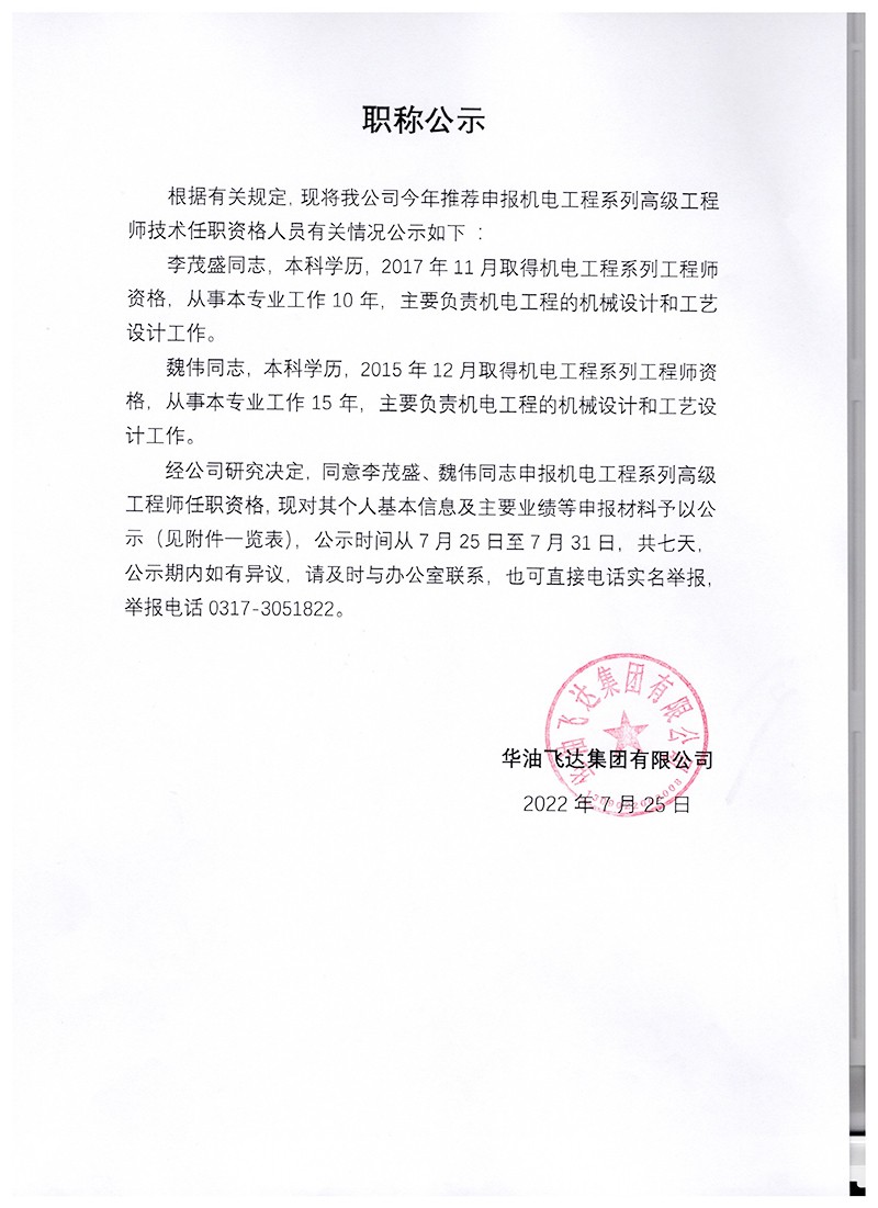2022年7月25日经公司研究决定同意李茂盛、魏伟同志申报高级机电工程高级工程师技术任职资格人员现以公示,公示时间7月25日至7月31日。