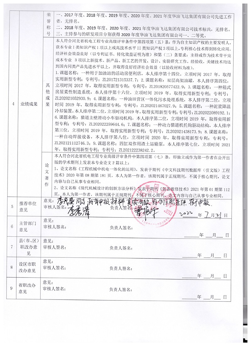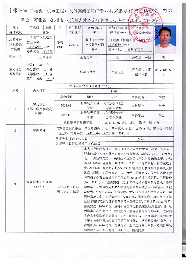 我公司推荐李茂盛和魏伟同志申报高级机电工程高级工程师技术任职资格人员